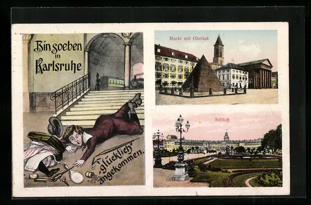 AK Karlsruhe, Markt mit Obelisk, Schloss, Bahnhof
