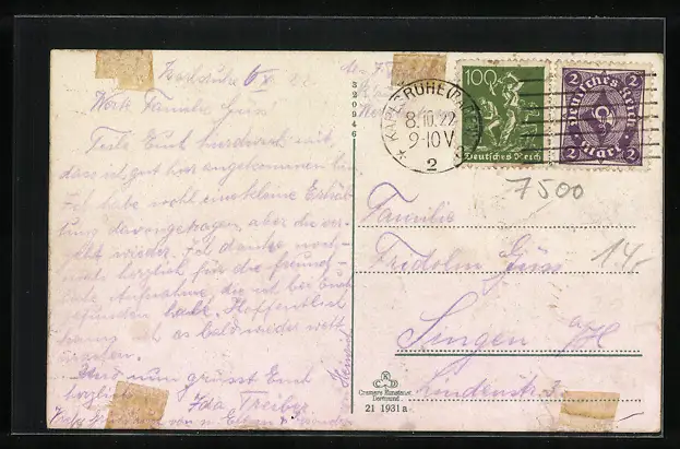 gelaufen 1922, rückseitig Klebe- und Papierreste, guter Zustand