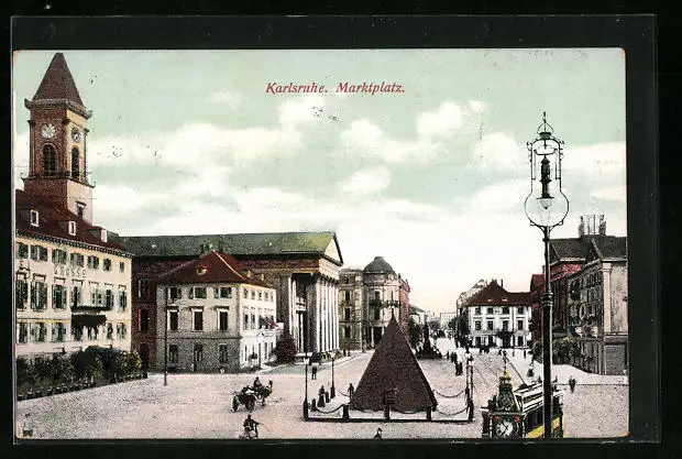 AK Karlsruhe, Marktplatz mit Strassenbahn