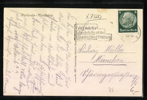 Personenbezogene Daten auf der Rückseite der Karte wurden durch blauen Textmarker unkenntlich gemacht. Die blauen Stellen sind auf die Vorderseite durchgeweicht und wirken sich negativ auf das Postkartenfoto aus
