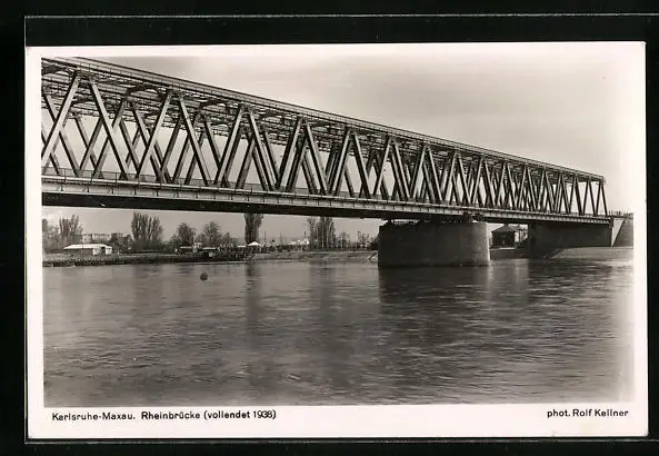 AK Karlsruhe-Maxau, Rheinbrücke mit Flusspartie