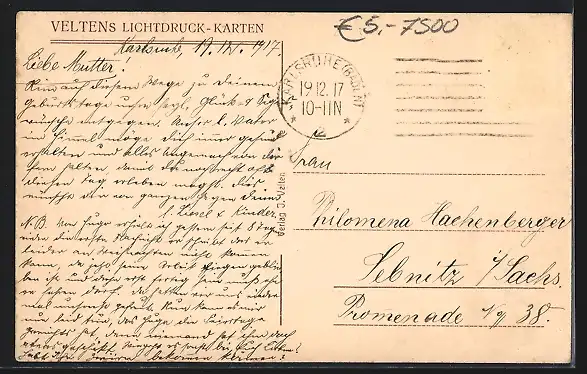 alte Ansichtskarte, gelaufen 1917, Briefmarke entfernt, Eckknicke re., guter Zustand