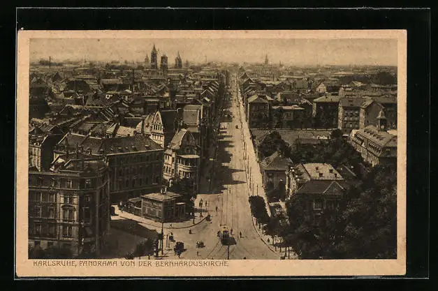 AK Karlsruhe, Panorama von der Bernharduskirche, Strassenpartie mit Strassenbahn