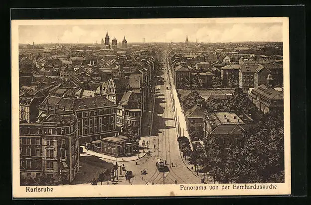 AK Karlsruhe, Panorama von der Bernharduskirche mit Strassenbahn