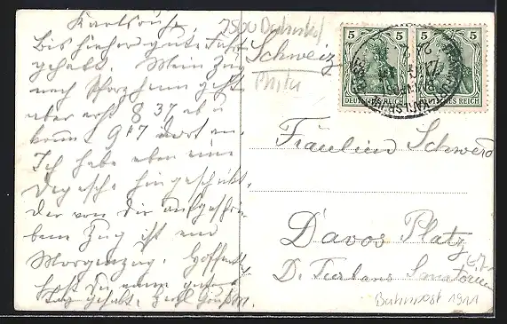 Personenbezogene Daten auf der Rückseite der Karte wurden durch blauen Textmarker unkenntlich gemacht. Die blauen Stellen sind auf die Vorderseite durchgeweicht und wirken sich negativ auf das Postkartenfoto aus
