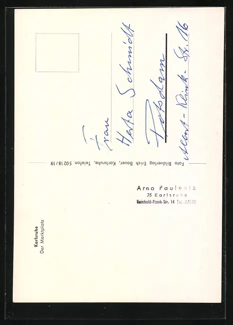 Personenbezogene Daten auf der Rückseite der Karte wurden durch blauen Textmarker unkenntlich gemacht. Die blauen Stellen sind auf die Vorderseite durchgeweicht und wirken sich negativ auf das Postkartenfoto aus