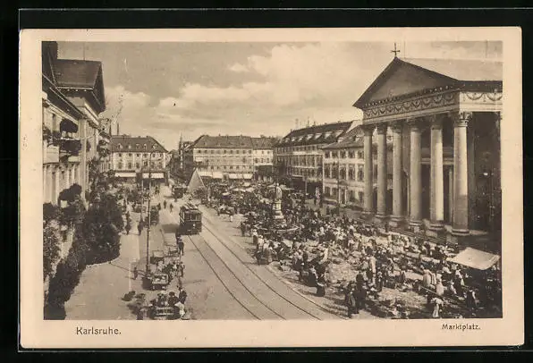 AK Karlsruhe, Partie am Marktplatz mit Strassenbahn