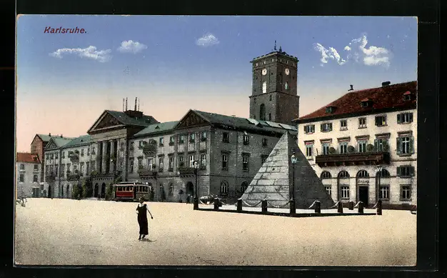 AK Karlsruhe, Partie am Pyramidengrabmal mit Strassenbahn
