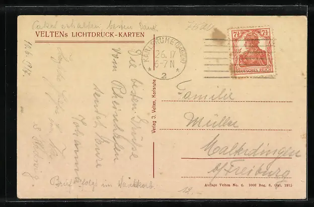 Personenbezogene Daten auf der Rückseite der Karte wurden durch blauen Textmarker unkenntlich gemacht. Die blauen Stellen sind auf die Vorderseite durchgeweicht und wirken sich negativ auf das Postkartenfoto aus
