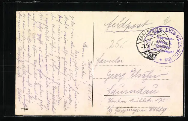 Personenbezogene Daten auf der Rückseite der Karte wurden durch blauen Textmarker unkenntlich gemacht. Die blauen Stellen sind auf die Vorderseite durchgeweicht und wirken sich negativ auf das Postkartenfoto aus