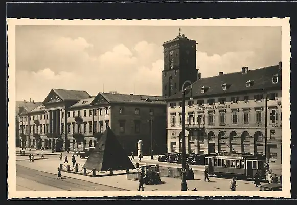 AK Karlsruhe, Platz mit Strassenbahn und Pyramide