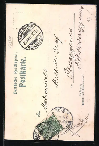 alte Ansichtskarte, gelaufen 1901, Stempelspur, untere Kante beschnitten