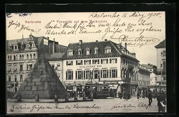 AK Karlsruhe, Pyramide mit Hotel Englischer Hof, Strassenbahn