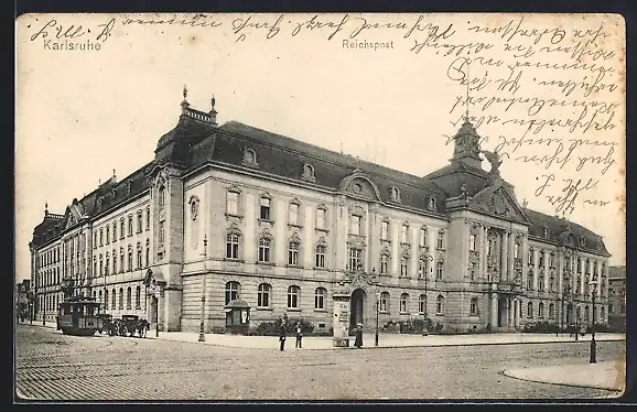 AK Karlsruhe, Reichspost mit Strassenbahn