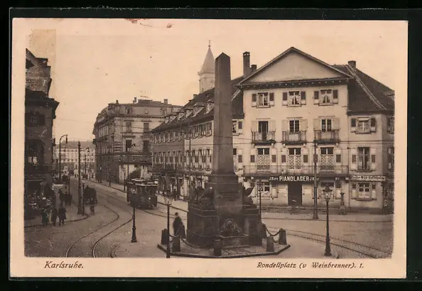 AK Karlsruhe, Rondellplatz mit Denkmal und Strassenbahn