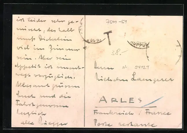 Personenbezogene Daten auf der Rückseite der Karte wurden durch blauen Textmarker unkenntlich gemacht. Die blauen Stellen sind auf die Vorderseite durchgeweicht und wirken sich negativ auf das Postkartenfoto aus