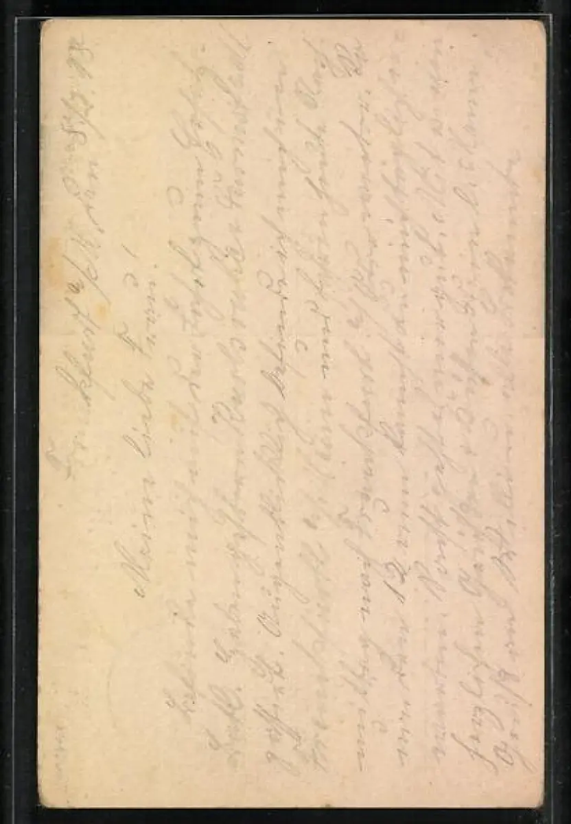 Personenbezogene Daten auf der Rückseite der Karte wurden durch blauen Textmarker unkenntlich gemacht. Die blauen Stellen sind auf die Vorderseite durchgeweicht und wirken sich negativ auf das Postkartenfoto aus