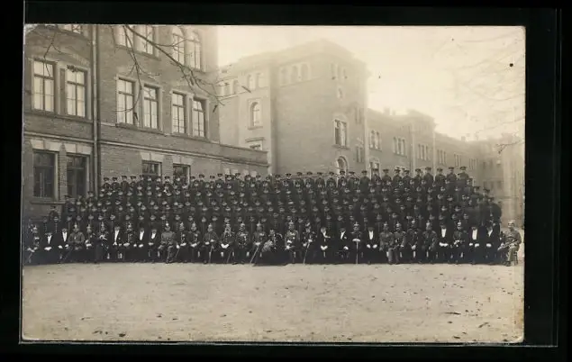 AK Karlsruhe, Soldaten in Uniform posieren im Innenhof der Kaserne