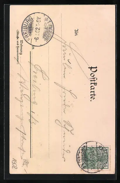 Personenbezogene Daten auf der Rückseite der Karte wurden durch blauen Textmarker unkenntlich gemacht. Die blauen Stellen sind auf die Vorderseite durchgeweicht und wirken sich negativ auf das Postkartenfoto aus