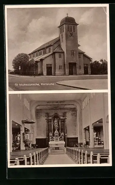 AK Karlsruhe, St. Michaelskirche, Aussen- und Innenansicht