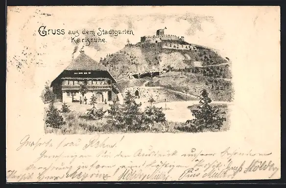AK Karlsruhe, Stadtgarten, Schwarzwaldhaus und Burg