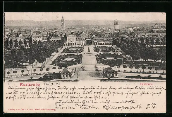 AK Karlsruhe, Stadtpanorama mit dem Parkgarten im Vordergrund