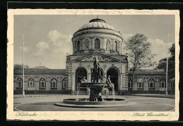 AK Karlsruhe, Städtisches Vierordtbad mit Brunnen