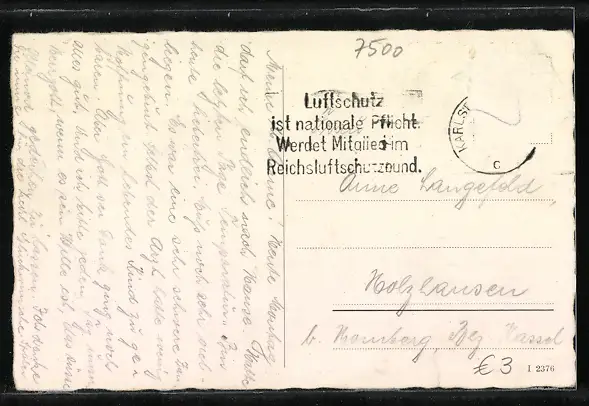 Personenbezogene Daten auf der Rückseite der Karte wurden durch blauen Textmarker unkenntlich gemacht. Die blauen Stellen sind auf die Vorderseite durchgeweicht und wirken sich negativ auf das Postkartenfoto aus