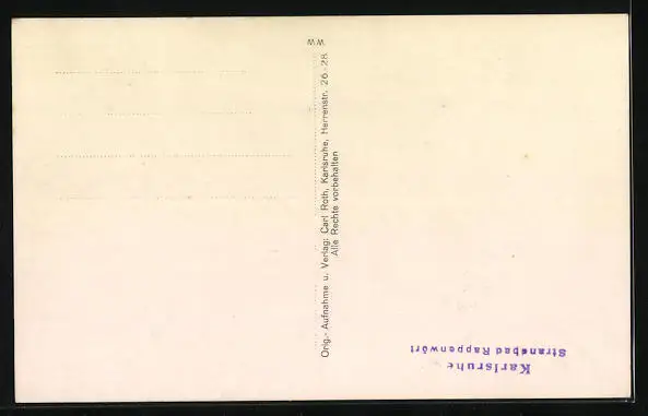Personenbezogene Daten auf der Rückseite der Karte wurden durch blauen Textmarker unkenntlich gemacht. Die blauen Stellen sind auf die Vorderseite durchgeweicht und wirken sich negativ auf das Postkartenfoto aus