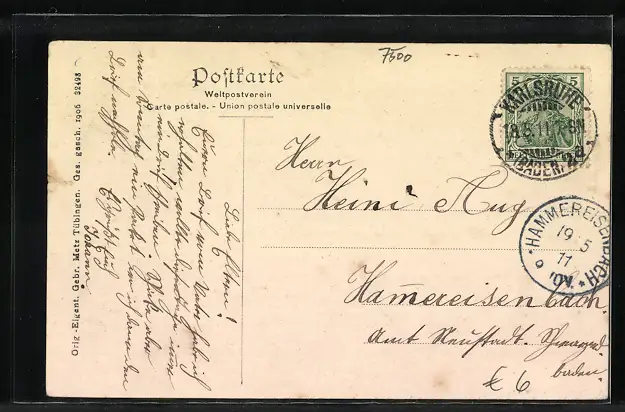 Personenbezogene Daten auf der Rückseite der Karte wurden durch blauen Textmarker unkenntlich gemacht. Die blauen Stellen sind auf die Vorderseite durchgeweicht und wirken sich negativ auf das Postkartenfoto aus