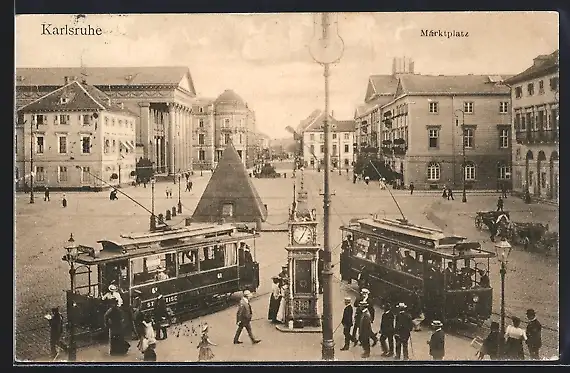AK Karlsruhe, Strassenbahn am Marktplatz