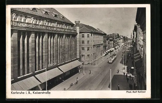AK Karlsruhe, Strassenbahn in der Kaiserstrasse