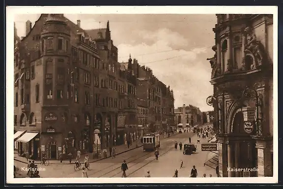 AK Karlsruhe, Strassenbahn passiert die Geschäfte in der Kaiserstrasse
