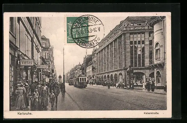 AK Karlsruhe, Strassenbahn und Geschäfte in der Kaiserstrasse