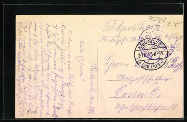 Personenbezogene Daten auf der Rückseite der Karte wurden durch blauen Textmarker unkenntlich gemacht. Die blauen Stellen sind auf die Vorderseite durchgeweicht und wirken sich negativ auf das Postkartenfoto aus