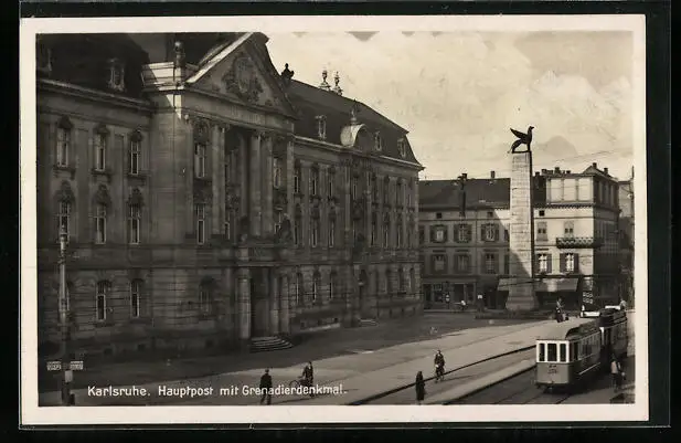 AK Karlsruhe, Strassenbahn vor der Hauptpost mit dem Grenadierdenkmal