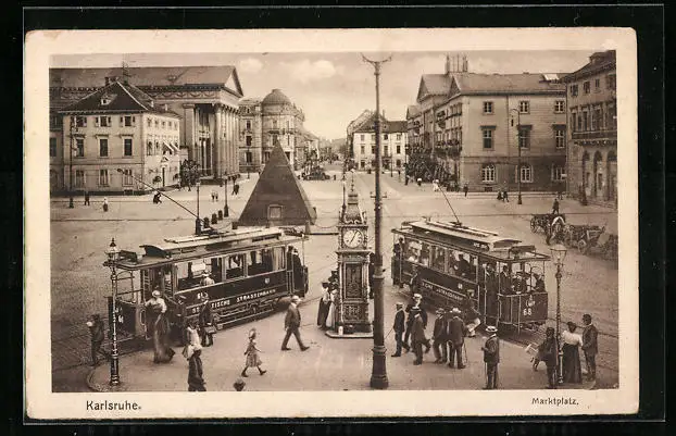 AK Karlsruhe, Strassenbahnen auf dem Marktplatz