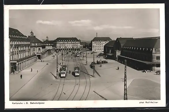 AK Karlsruhe, Strassenbahnen und Autos am Bahnhofsplatz
