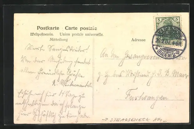 alte Ansichtskarte, gelaufen 1907, Stempelspur, guter Zustand
