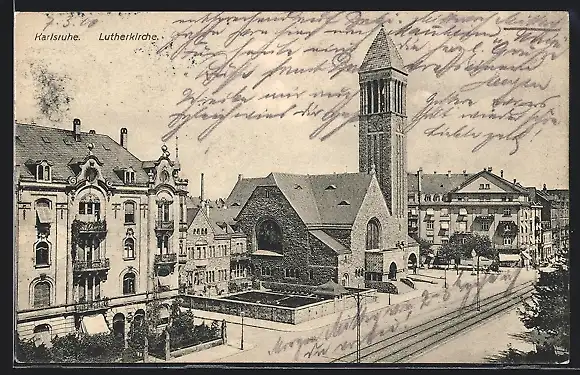 AK Karlsruhe, Strassenpartie mit Lutherkirche