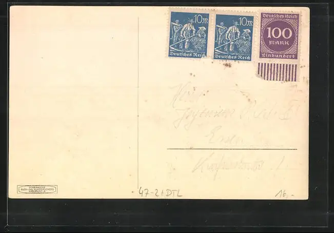 Personenbezogene Daten auf der Rückseite der Karte wurden durch blauen Textmarker unkenntlich gemacht. Die blauen Stellen sind auf die Vorderseite durchgeweicht und wirken sich negativ auf das Postkartenfoto aus
