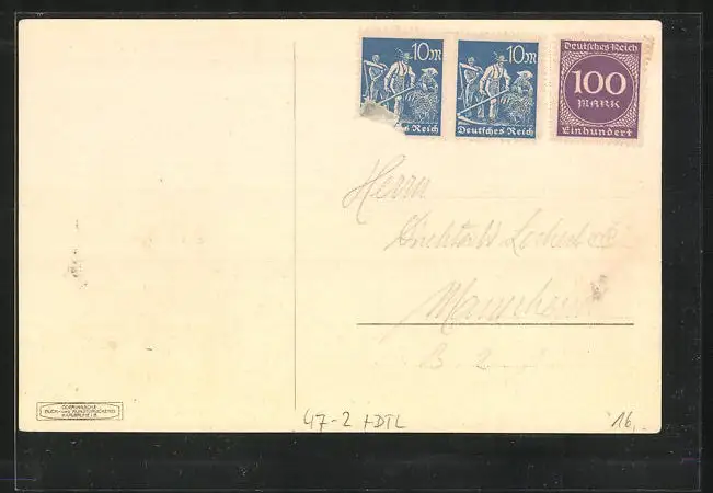 Personenbezogene Daten auf der Rückseite der Karte wurden durch blauen Textmarker unkenntlich gemacht. Die blauen Stellen sind auf die Vorderseite durchgeweicht und wirken sich negativ auf das Postkartenfoto aus