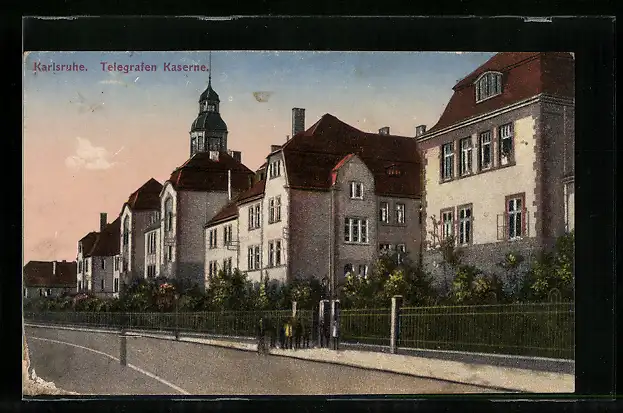 AK Karlsruhe, Telegrafen Kaserne mit Strassenpartie