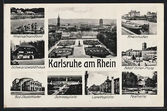 AK Karlsruhe am Rhein, Rheinhafen, Platz, Festhalle, Lorettoplatz, Schwarzwaldhaus