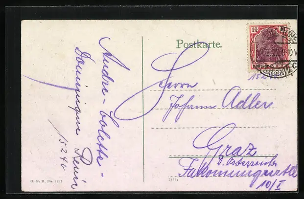 Personenbezogene Daten auf der Rückseite der Karte wurden durch blauen Textmarker unkenntlich gemacht. Die blauen Stellen sind auf die Vorderseite durchgeweicht und wirken sich negativ auf das Postkartenfoto aus