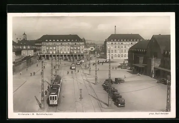 AK Karlsruhe i. B., Bahnhofsplatz mit Strassenbahn