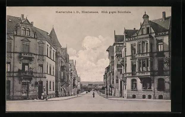 AK Karlsruhe i. B., Hirschstrasse mit Geschäft und Blick gegen Beitertheim