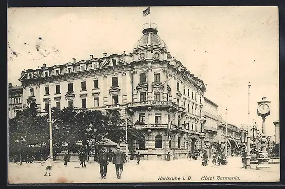 AK Karlsruhe i. B., Hotel Germania mit Strassenpartie