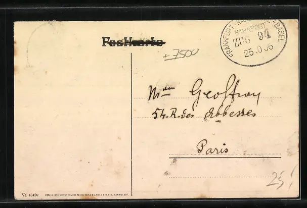 Personenbezogene Daten auf der Rückseite der Karte wurden durch blauen Textmarker unkenntlich gemacht. Die blauen Stellen sind auf die Vorderseite durchgeweicht und wirken sich negativ auf das Postkartenfoto aus