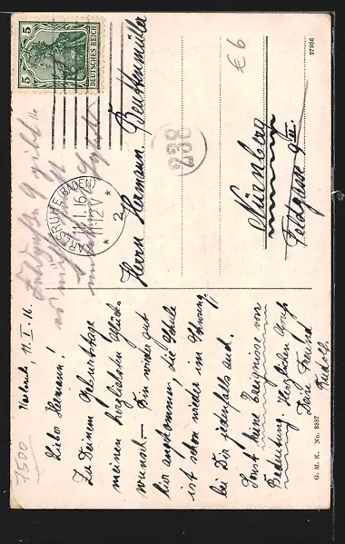 gelaufen 1916, Ecken bestoßen, guter Zustand